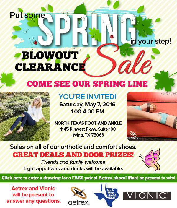 Mark your calendar! On Saturday, May 7th, 2016 from 1:00 – 4:00 PM we’re having our “Spring Blowout Sale.” You, your family, and your friends are all invited. Here’s what you can expect: Light appetizers and drinks A drawing to win a free pair of Aetrex shoes (you need to be present to win) Lots … Continue reading Spring Blowout Sale Sat. 5/7 – Win a FREE Pair of Orthotic Shoes!